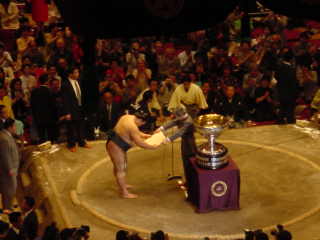 Prime Minister Koizumi giving prize to Takanohana (Tokyo May01):